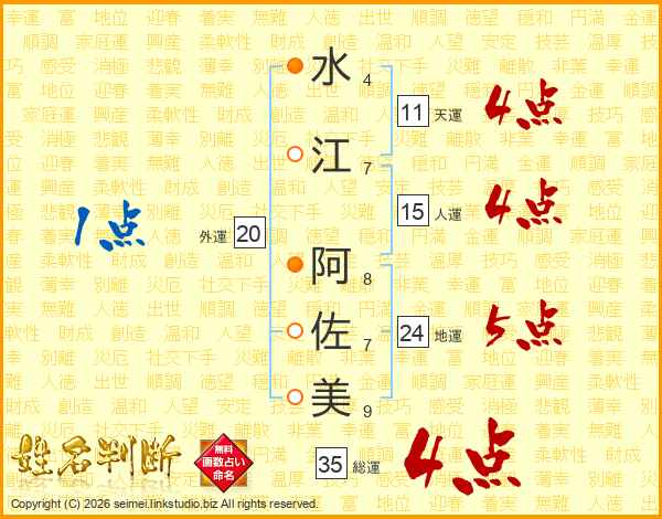 水(4画)江(7画) 阿(8画)佐(7画)美(9画)