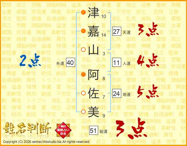 津(10画)嘉(14画)山(3画) 阿(8画)佐(7画)美(9画)