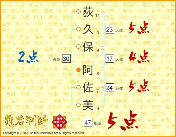 荻(11画)久(3画)保(9画) 阿(8画)佐(7画)美(9画)