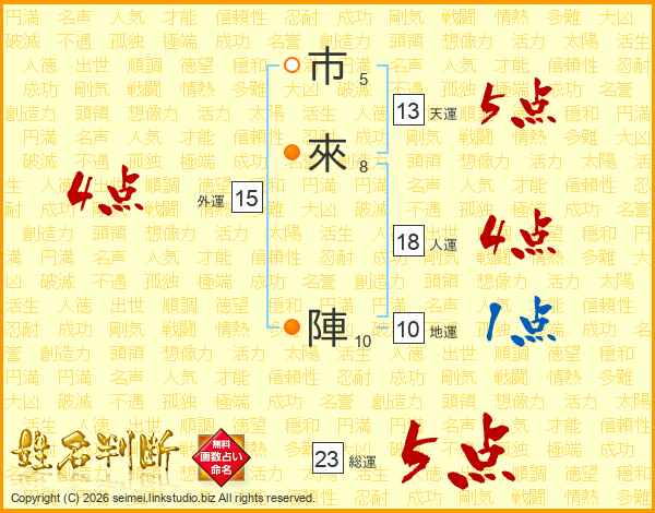 生活面を象徴する運勢です。外部から受ける影響力を表し、結婚運、家庭運や職場、環境への順応性を表します。総運から人運を引いた画数。姓や名が1文字の場合を除く。