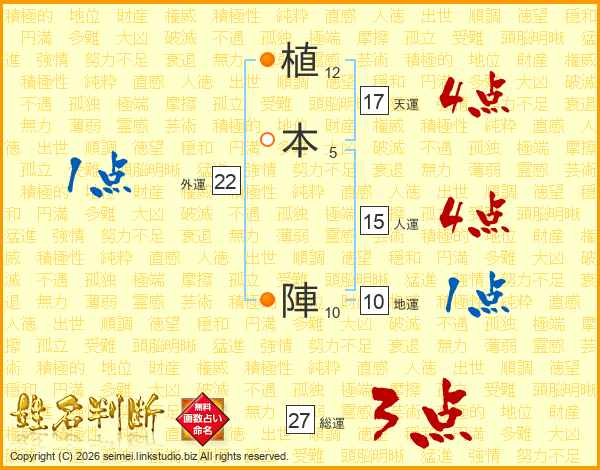 生活面を象徴する運勢です。外部から受ける影響力を表し、結婚運、家庭運や職場、環境への順応性を表します。総運から人運を引いた画数。姓や名が1文字の場合を除く。