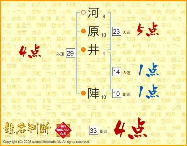 生活面を象徴する運勢です。外部から受ける影響力を表し、結婚運、家庭運や職場、環境への順応性を表します。総運から人運を引いた画数。姓や名が1文字の場合を除く。