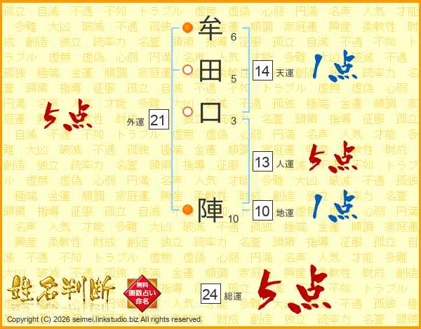 生活面を象徴する運勢です。外部から受ける影響力を表し、結婚運、家庭運や職場、環境への順応性を表します。総運から人運を引いた画数。姓や名が1文字の場合を除く。