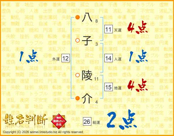 生活面を象徴する運勢です。外部から受ける影響力を表し、結婚運、家庭運や職場、環境への順応性を表します。総運から人運を引いた画数。姓や名が1文字の場合を除く。