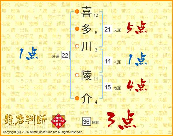 喜(12画)多(6画)川(3画) 陵(11画)介(4画)