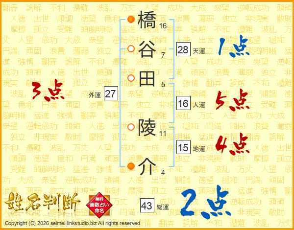 橋(16画)谷(7画)田(5画) 陵(11画)介(4画)