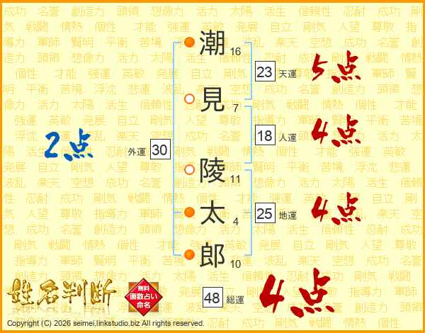 潮(16画)見(7画) 陵(11画)太(4画)郎(10画)