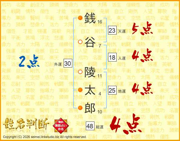 銭(16画)谷(7画) 陵(11画)太(4画)郎(10画)