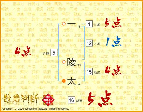 生活面を象徴する運勢です。外部から受ける影響力を表し、結婚運、家庭運や職場、環境への順応性を表します。総運から人運を引いた画数。姓や名が1文字の場合を除く。