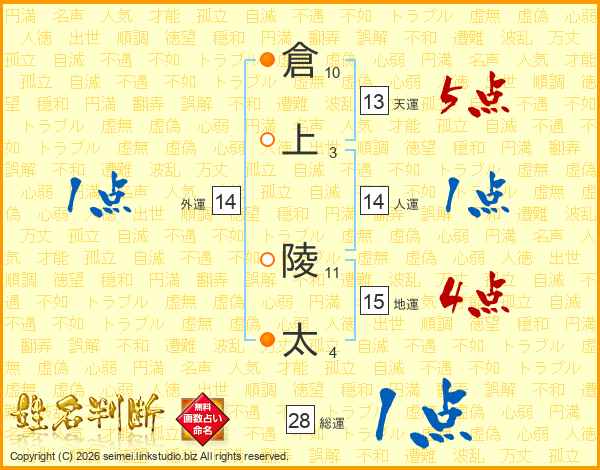 生活面を象徴する運勢です。外部から受ける影響力を表し、結婚運、家庭運や職場、環境への順応性を表します。総運から人運を引いた画数。姓や名が1文字の場合を除く。