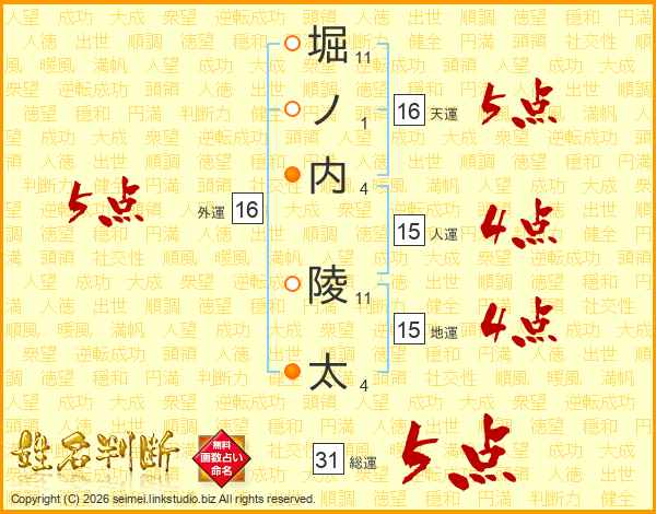 堀(11画)ノ(1画)内(4画) 陵(11画)太(4画)