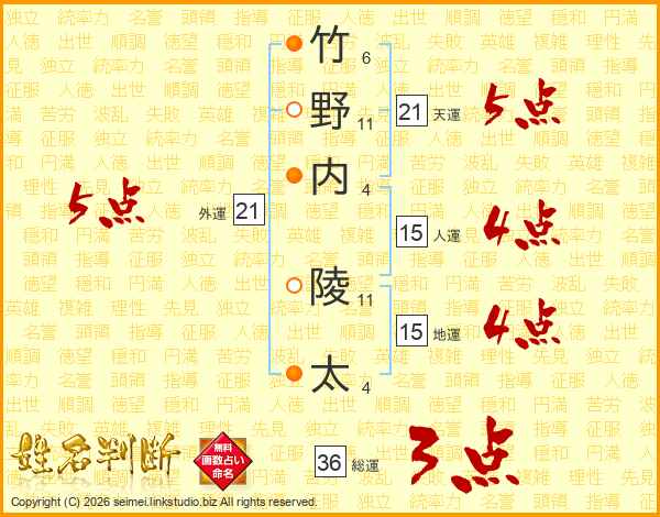 竹(6画)野(11画)内(4画) 陵(11画)太(4画)