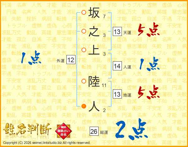 坂(7画)之(3画)上(3画) 陸(11画)人(2画)