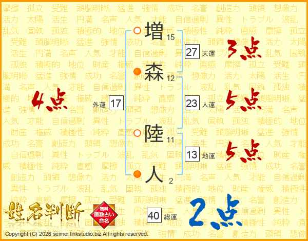あなたの人生を表す1番重要な運勢です。生涯を通じて影響する総合運となり、主に50歳以降の晩年期に影響を及ぼします。苗字と名前の合計画数。