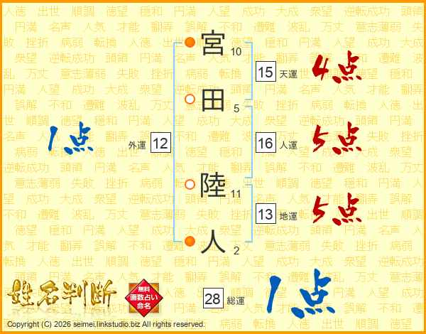 宮田陸人さんの総運は28画の1点!