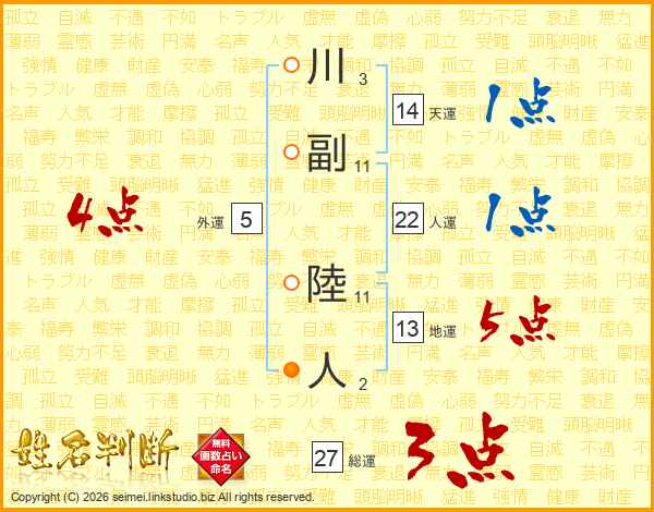 川副陸人さんの総運は27画の3点!