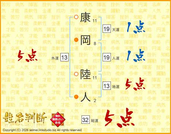 康岡陸人さんの総運は32画の5点!
