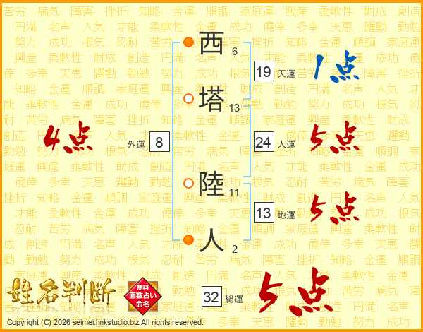 西塔陸人さんの総運は32画の5点!