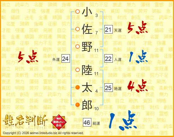 小佐野陸太郎さんの総運は46画の1点!
