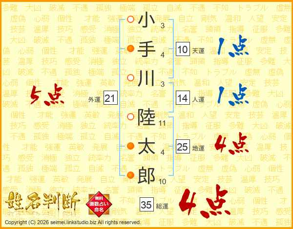 小(3画)手(4画)川(3画) 陸(11画)太(4画)郎(10画)