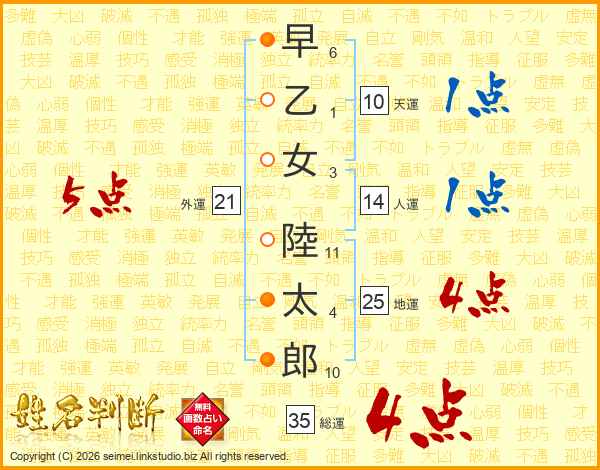 早乙女陸太郎さんの総運は35画の4点!
