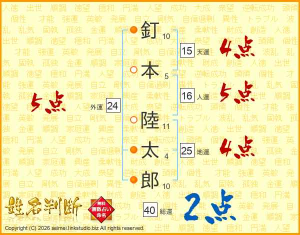釘本陸太郎さんの総運は40画の2点!