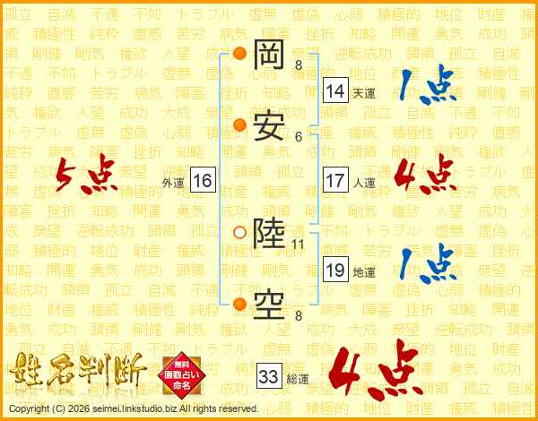生活面を象徴する運勢です。外部から受ける影響力を表し、結婚運、家庭運や職場、環境への順応性を表します。総運から人運を引いた画数。姓や名が1文字の場合を除く。