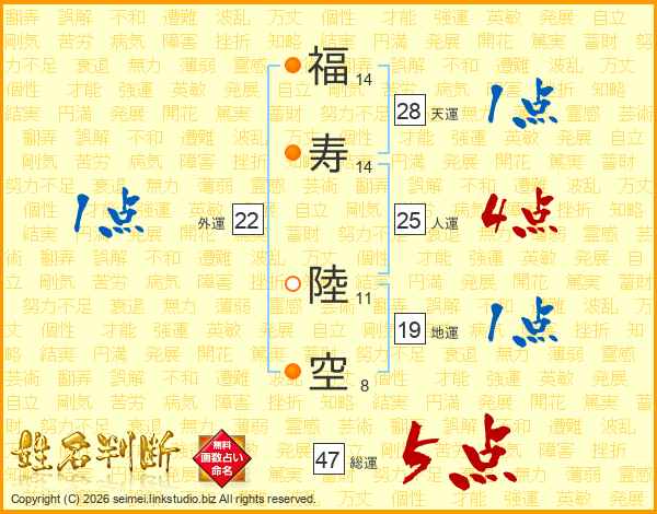 生活面を象徴する運勢です。外部から受ける影響力を表し、結婚運、家庭運や職場、環境への順応性を表します。総運から人運を引いた画数。姓や名が1文字の場合を除く。