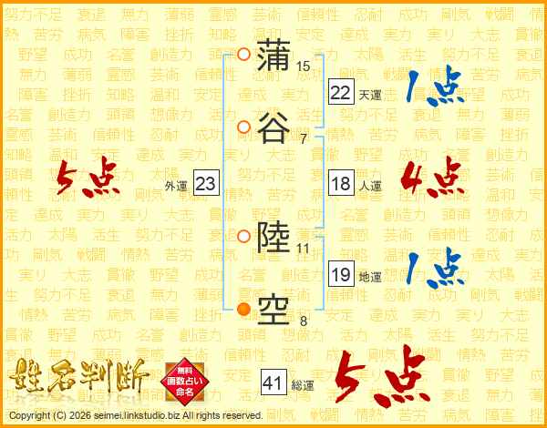 蒲(15画)谷(7画) 陸(11画)空(8画)