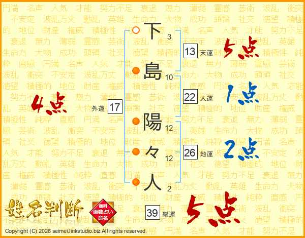 生活面を象徴する運勢です。外部から受ける影響力を表し、結婚運、家庭運や職場、環境への順応性を表します。総運から人運を引いた画数。姓や名が1文字の場合を除く。