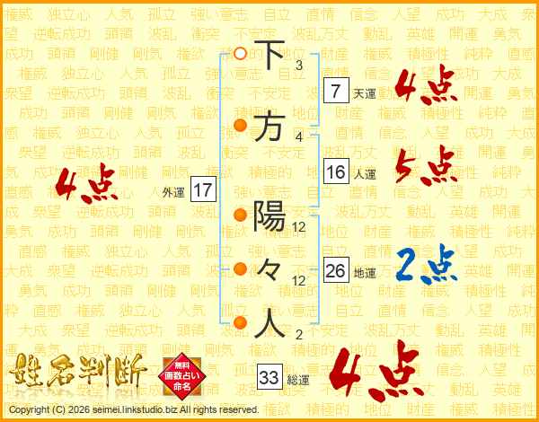 生活面を象徴する運勢です。外部から受ける影響力を表し、結婚運、家庭運や職場、環境への順応性を表します。総運から人運を引いた画数。姓や名が1文字の場合を除く。