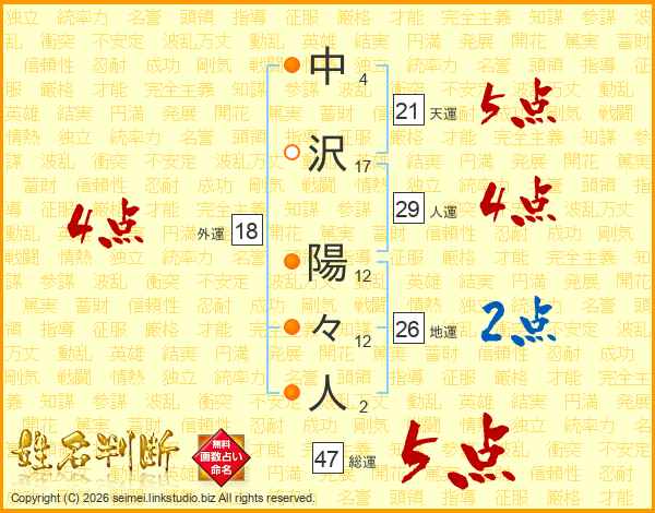 中沢陽々人さんの総運は47画の5点!