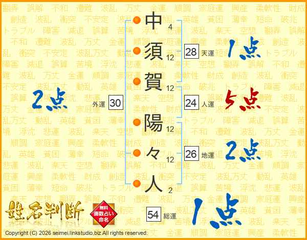 中(4画)須(12画)賀(12画) 陽(12画)々(12画)人(2画)