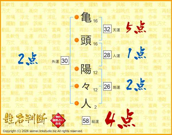 亀頭陽々人さんの総運は58画の4点!