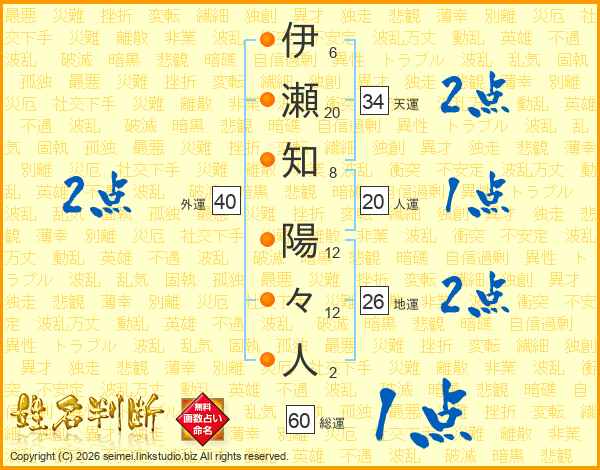 伊(6画)瀬(20画)知(8画) 陽(12画)々(12画)人(2画)