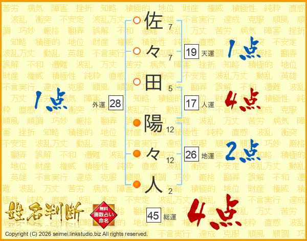 佐(7画)々(7画)田(5画) 陽(12画)々(12画)人(2画)