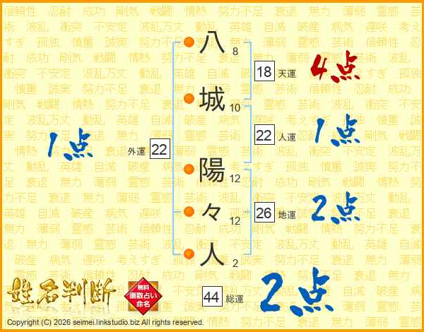 生活面を象徴する運勢です。外部から受ける影響力を表し、結婚運、家庭運や職場、環境への順応性を表します。総運から人運を引いた画数。姓や名が1文字の場合を除く。