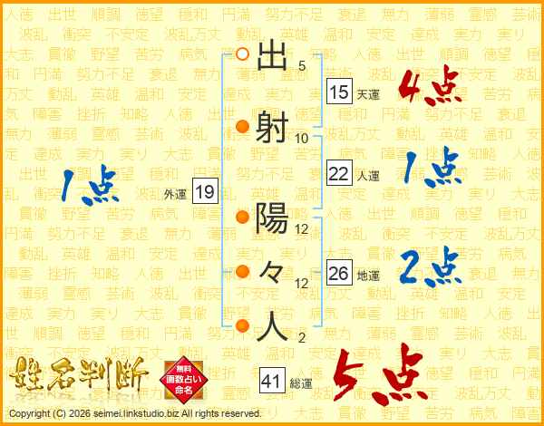 生活面を象徴する運勢です。外部から受ける影響力を表し、結婚運、家庭運や職場、環境への順応性を表します。総運から人運を引いた画数。姓や名が1文字の場合を除く。