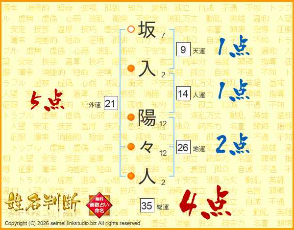 坂(7画)入(2画) 陽(12画)々(12画)人(2画)