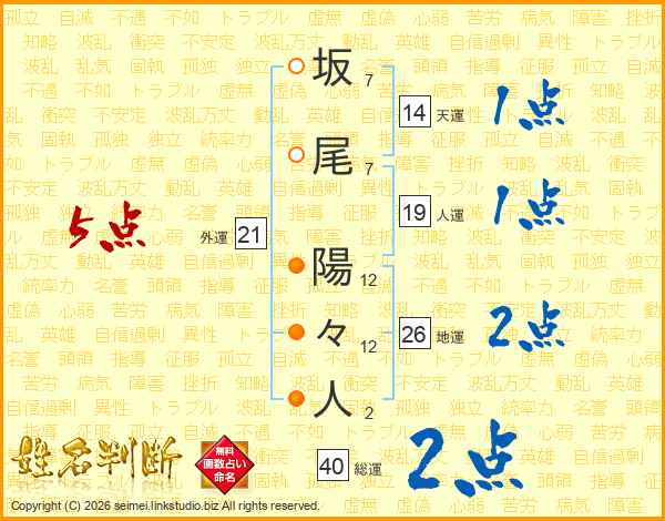 坂(7画)尾(7画) 陽(12画)々(12画)人(2画)