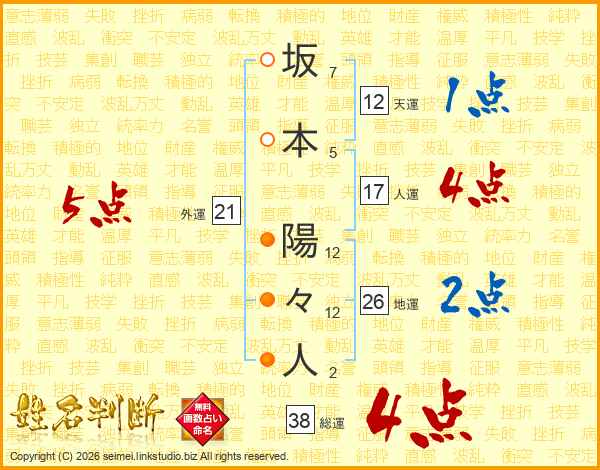 坂本陽々人さんの総運は38画の4点!
