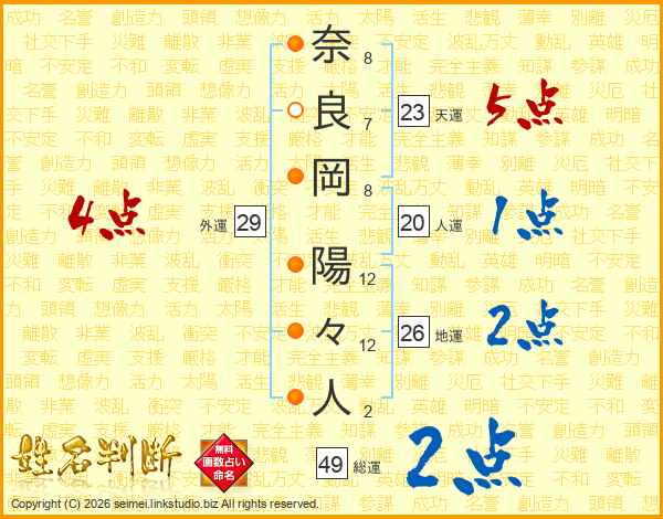 奈(8画)良(7画)岡(8画) 陽(12画)々(12画)人(2画)