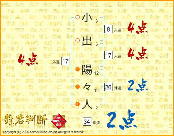 生活面を象徴する運勢です。外部から受ける影響力を表し、結婚運、家庭運や職場、環境への順応性を表します。総運から人運を引いた画数。姓や名が1文字の場合を除く。