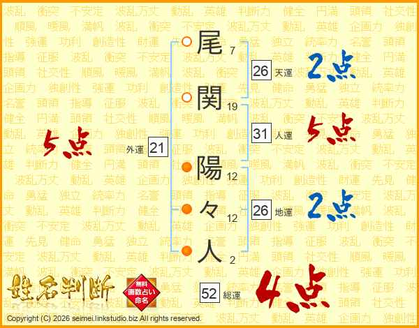 尾関陽々人さんの総運は52画の4点!