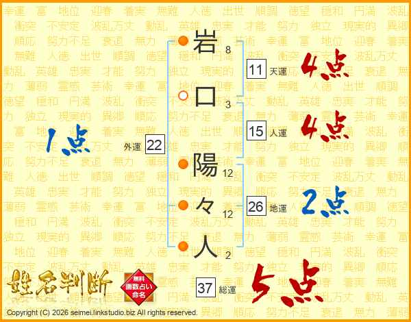 岩(8画)口(3画) 陽(12画)々(12画)人(2画)