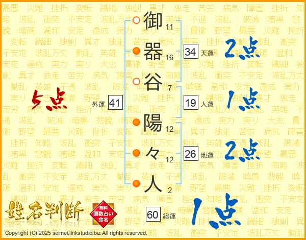 御(11画)器(16画)谷(7画) 陽(12画)々(12画)人(2画)