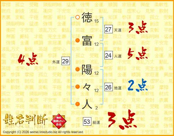 徳(15画)富(12画) 陽(12画)々(12画)人(2画)