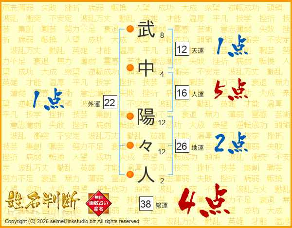 武(8画)中(4画) 陽(12画)々(12画)人(2画)