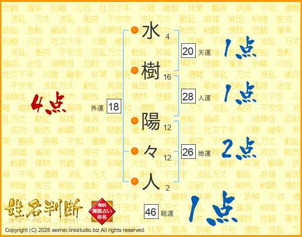 水(4画)樹(16画) 陽(12画)々(12画)人(2画)