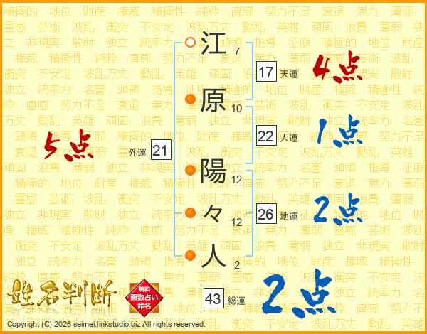 江原陽々人さんの総運は43画の2点!